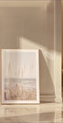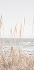 Et blødt kystfotografi med høje strå, der svajer ved kystlinjen med havet i baggrunden. De naturlige beige toner og den rolige horisont skaber en afslappende atmosfære, ideel til rolige, naturinspirerede interiører.
