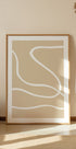 En beroligende, minimalistisk plakat med flydende hvide linjer på beige baggrund. Den abstrakte komposition udstråler enkelhed, harmoni og elegance, og gør den til et tidløst stykke til moderne interiører.