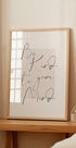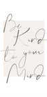 En beroligende minimalistisk typografiplakat med det håndskrevne citat “Be Kind to Your Mind.” En blid påmindelse om mindfulness, positivitet og egenomsorg, perfekt til soveværelser, kontorer, terapirum eller wellnessområder. De bløde toner og den elegante kalligrafi giver både inspiration og ro til enhver væg.