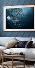 En fantastisk undervandsplakat med en havskildpadde, der glider gennem en hvirvlende stime af fisk i det dybblå hav. Optaget ved Similanøerne i Thailand, indfanger dette motiv skønheden og kaoset i det marine liv.
