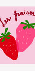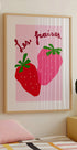 En legende og livlig jordbærplakat med stærke røde og lyserøde nuancer og håndskrevet fransk tekst "Les fraises". Perfekt til retro køkkenindretning, valentinsinspiration eller for enhver, der elsker frugtkunst.