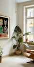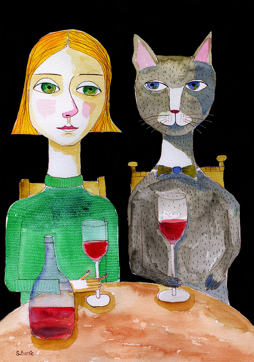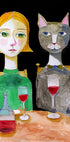 En finurlig illustration af en kvinde og en kat, der deler vin ved et bord. Det legende og fantasifulde kunstværk kombinerer humor og charme, med stærke farver og udtryksfulde detaljer. Perfekt til at tilføje et sjovt og kunstnerisk præg til køkkener, barer eller gallerivægge.