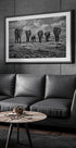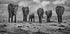 Et stærkt sort-hvidt dyrefotografi af en flok elefanter, der vandrer over den afrikanske savanne. Billedet indfanger både styrke og ømhed og symboliserer familie, beskyttelse og enhed i naturen.