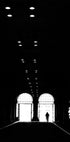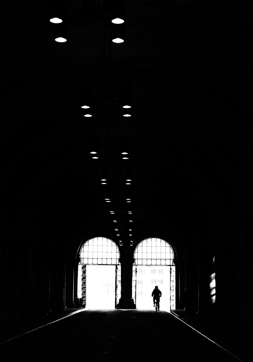 Bike in Amsterdam af Seray AK fanger en ensom cyklist som silhuet i en oplyst arkade i Amsterdam. Rytteren glider gennem buede gange, hvor lys og skygge skaber grafiske linjer, dybde og et tydeligt forsvindingspunkt. Kontrasten og natlyset understreger byens grafiske arkader. Perspektivet leder blikket mod dybden.
