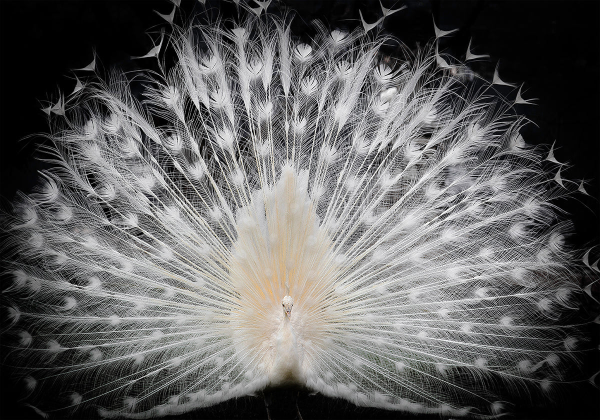 Et betagende fotografi af en sjælden hvid påfugl med fjerene fuldt spredt, som danner et indviklet og delikat mønster af ren elegance. Dette iøjnefaldende kunstværk symboliserer skønhed, ynde og sjældenhed og bliver et fascinerende midtpunkt i enhver indretning.