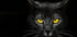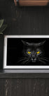 Et kraftfuldt close-up portræt af en sort kat med gennemtrængende gule øjne, der lyser i mørket. Dette low-key fotografi indfanger mystik, elegance og intensitet, og gør det til et markant kunstværk til enhver moderne indretning.