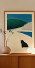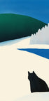 En ensom sort kat vandrer gennem et stille vinterlandskab af sneklædte træer og en frossen flodbred under en kølig, blå himmel. Minimalistiske former og skarp kontrast skaber ro og dybde, mens silhuetten leder blikket frem. Et poetisk naturmotiv af Little Dean, der udstråler stilfuld stillhed. En diskret hyldest til vinterens ro.