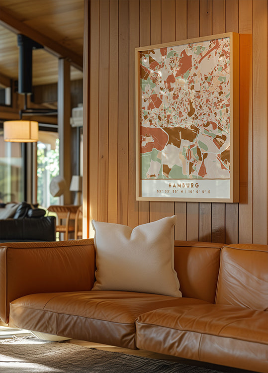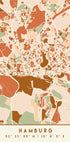En dramatisk, sort plakat i jordtoner, hvor et detaljeret bykort folder sig ud som et grafisk net af gader, kanaler og kvarterer. Emiliano Deificus forener minimalisme og varme farver til et nutidigt udtryk, der giver rummet dybde og retning og inviterer til nye urbane opdagelser. Subtile konturer fremhæver byens rytme.