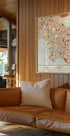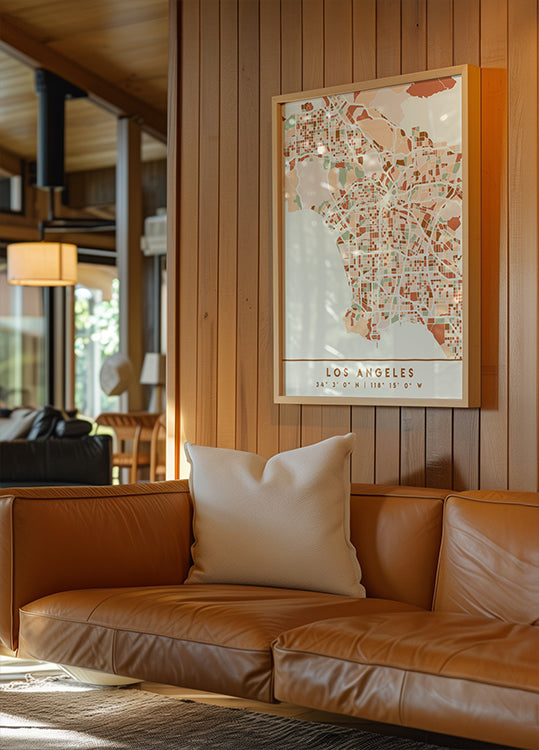 Black Maps Earth Tones 42 af Emiliano Deificus viser et stiliseret kort over Los Angeles i dybe, jordnære nuancer. Finmaskede gader, Hollywood-bakker og kystens konturer danner et elegant, grafisk mønster, der fanger storbyens rytme og gør sig perfekt som statement i både moderne og klassiske rum. Hæng den solo eller i en gallerivæg.