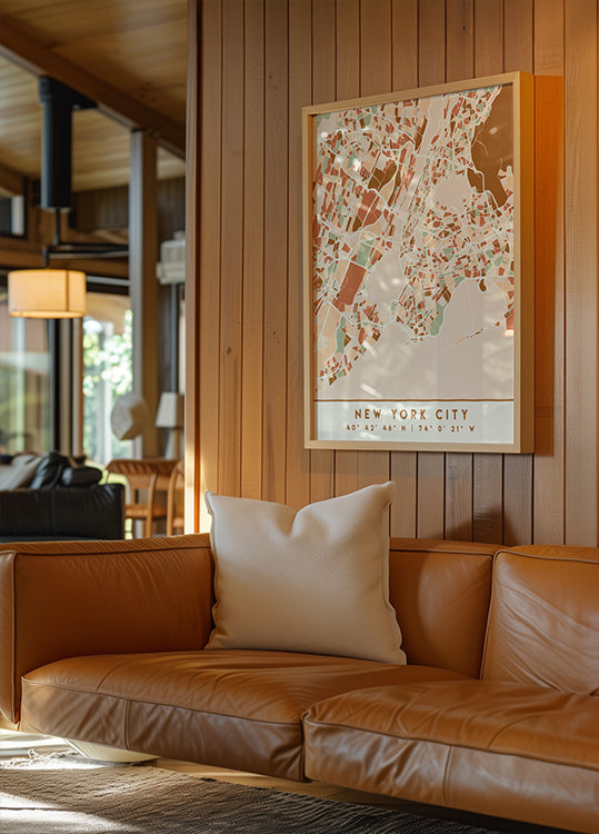 Black Maps Earth Tones 61 af Emiliano Deificus forvandler Manhattans ikoniske gadenet til et elegant kort i dybe, jordlige nuancer. De fine linjer, skygger og kontraster skildrer floder, broer og kvarterer med rolig præcision og giver et sofistikeret urbant fokuspunkt til enhver moderne væg. Perfekt til den designbevidste NYC-elsker.