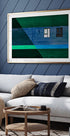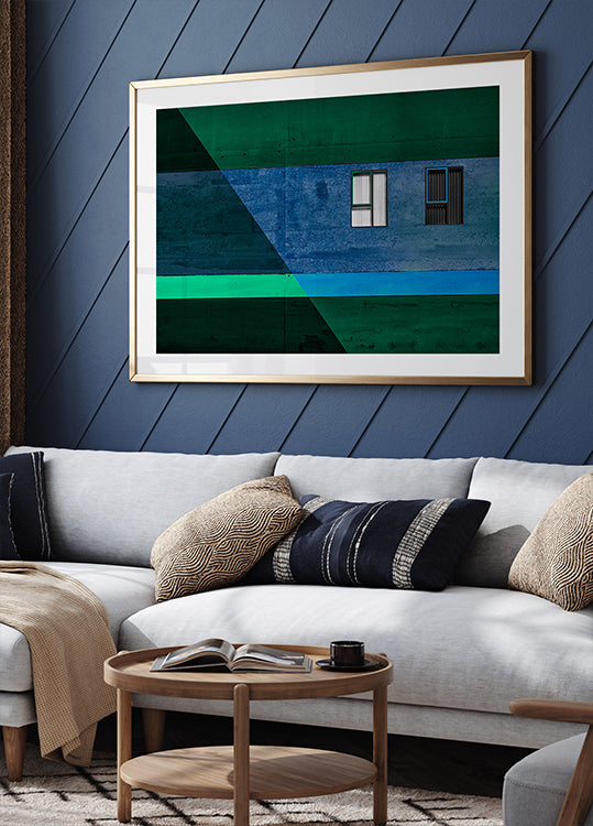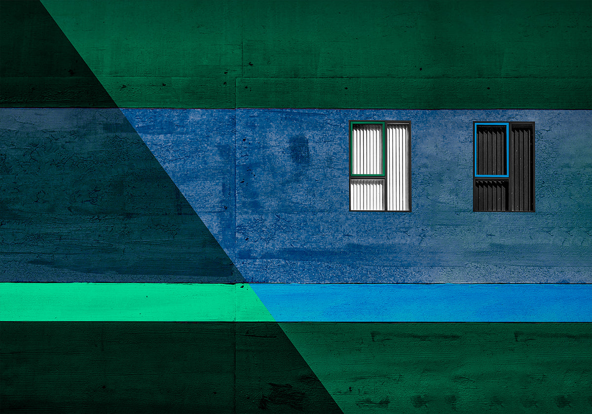 Et dristigt arkitektonisk kunstværk med to vinduer med markante sorte og hvide persienner, sat mod en tekstureret væg i dybe blå og grønne nuancer. De skarpe linjer og den geometriske komposition skaber et moderne abstrakt værk fyldt med balance, kontrast og visuel spænding.