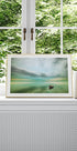 En fredfyldt scene med en ensom båd, der flyder stille på vandet under en overskyet himmel. Med dæmpede grønne og blå nuancer fremkalder dette rolige havsmotiv ensomhed, harmoni og stille eftertanke.