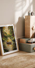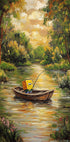 Et humoristisk parodiværk, der kombinerer klassisk oliemaleri landskabsstil med popkultur. Scenen viser en tegneseriefigur, der fisker fredeligt i en træbåd omgivet af frodige træer og en glødende flod. En legende blanding af natur og surrealistisk humor, perfekt til fans af skæv vægkunst.