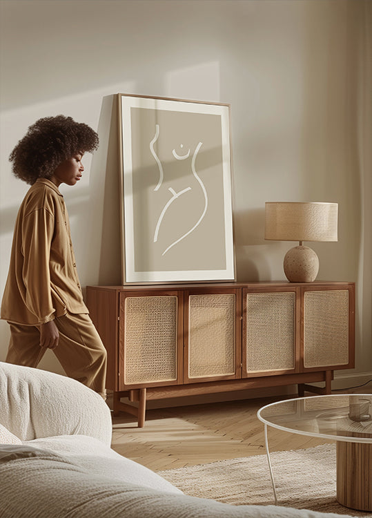 Body Sketch Sand forener minimalistisk linjekunst og varm sandtone: en kvindelig silhuet tegnet i bløde, kurvede konturer, der antyder bevægelse og ro. Det diskrete farvespil og den luftige komposition giver væggen et sofistikeret, sanseligt udtryk—ideel til stue, soveværelse eller galleri-væg. Perfekt i nordisk, moderne indretning.