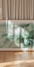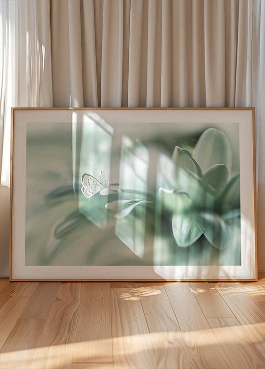 Et fint makrofotografi med en sommerfugl, der forsigtigt hviler ved siden af en funklende vanddråbe på bløde grønne kronblade. Med pastelfarver og en drømmende sløret baggrund indfanger dette kunstværk skrøbelighed, renhed og naturens stille skønhed.
