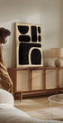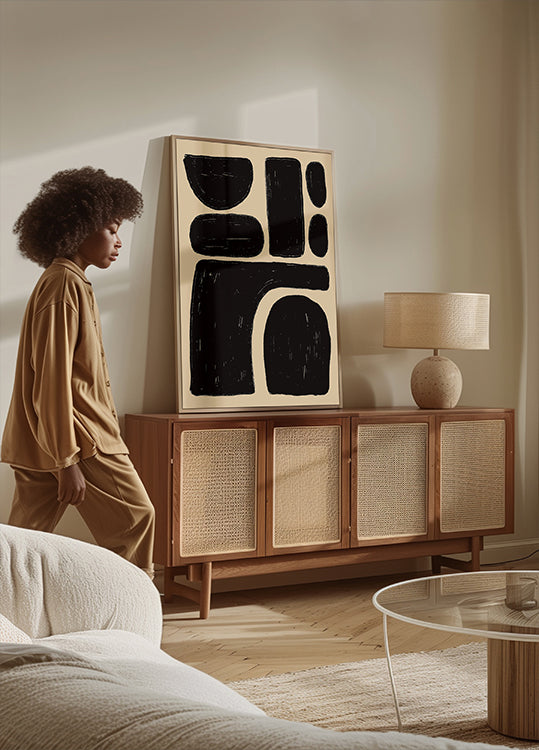 Et markant abstrakt kunstværk med dristige sorte former på en blød beige baggrund. De organiske former og den teksturerede penselstrøg skaber en moderne, minimalistisk æstetik — perfekt til moderne interiører, gallerivægge eller til alle, der elsker et rent, men kunstnerisk design.