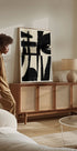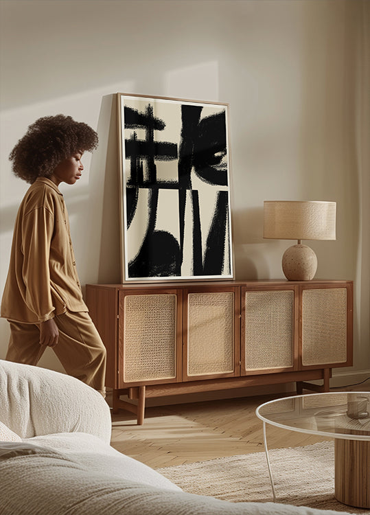 Et markant monokromt abstrakt kunstværk med kraftige sorte penselstrøg på en neutral baggrund. De teksturerede linjer og ekspressive former skaber en dynamisk balance mellem bevægelse og stilhed, hvilket gør dette til et moderne statement i samtidsindretning.