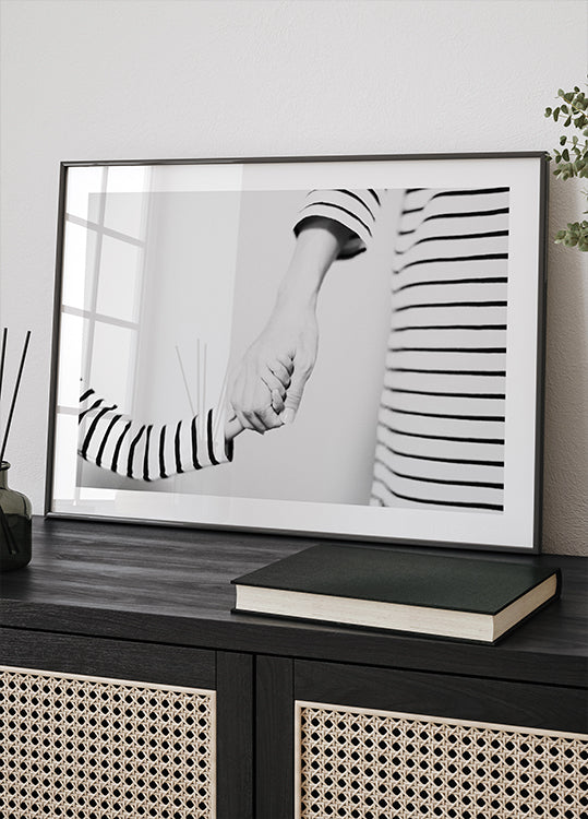 Denne rørende sort-hvid plakat fanger skønheden i forbindelse og tillid. Et ømt øjeblik mellem to hænder, indrammet af stribede klæder, symboliserer kærlighed, familie og fællesskab. Minimalistisk men dybt følelsesladet, et tidløst værk der passer perfekt i moderne og klassiske hjem.