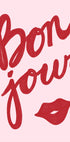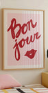 En legesyg og stilfuld typografiplakat med det franske ord Bonjour og en illustration af røde læber på en blød lyserød baggrund. Perfekt til moderne interiører og giver en feminin og elegant stemning til vægdekorationen.