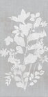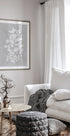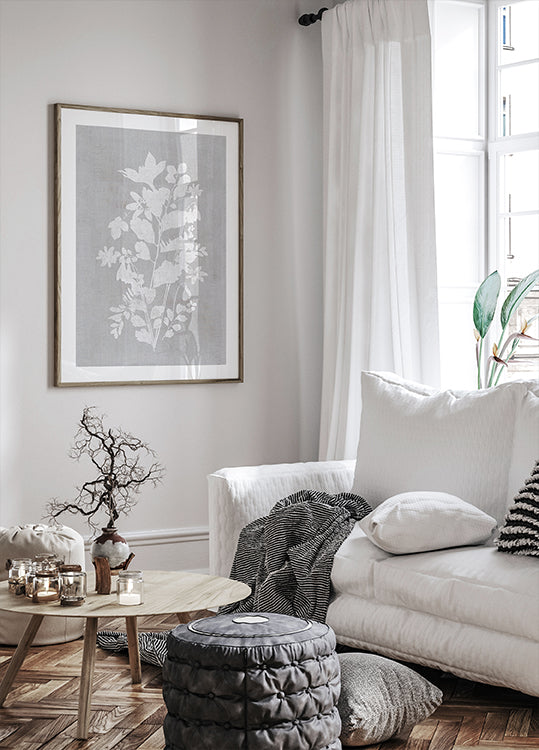 En minimalistisk botanisk illustrationsplakat med fine hvide blomstersilhuetter mod en blød grå baggrund med linnedstruktur. Elegant og moderne vægkunst, der giver ro og sofistikeret stemning til ethvert rum, perfekt til skandinaviske, japandi og minimalistiske interiører.