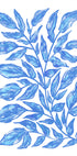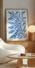 Et delikat botanisk tryk med håndmalede blå blade på en hvid baggrund. Akvarelstilen kombinerer minimalisme med elegance, hvilket gør det til et alsidigt valg for moderne interiører. Perfekt til at tilføje et frisk og naturligt præg til ethvert rum.