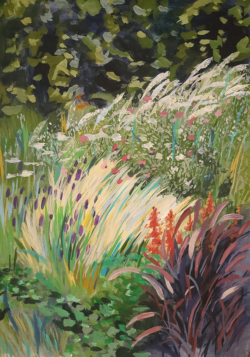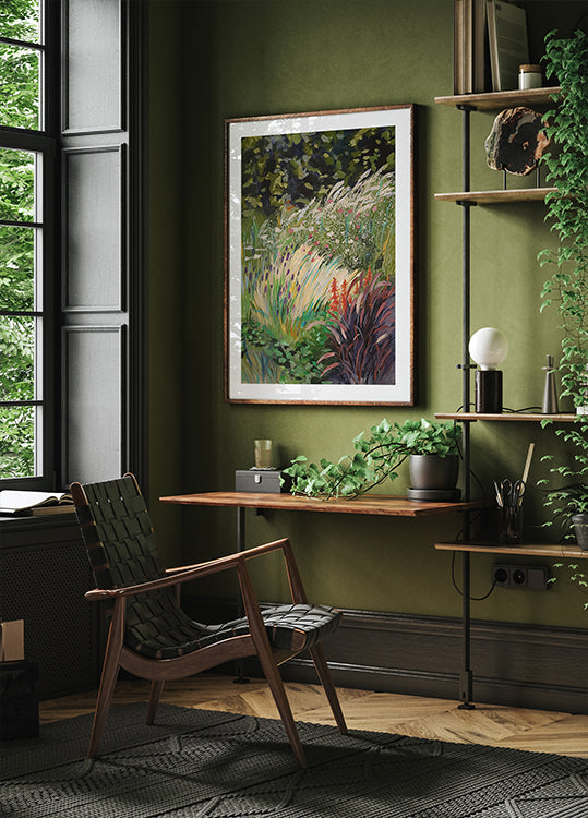 Claire Whiteheads Breezy indfanger en luftig, botanisk stemning: blomster og græs bølger i brisen, formet af bløde, grafiske felter og levende penselstrøg. Lag af akryl skaber dybde og rolig bevægelse, så motivet føles både poetisk og moderne—en frisk, naturlig accent til hjemmet. Perfekt til stue, soveværelse eller kontor.