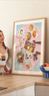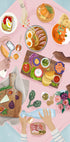 En livlig illustration, der indfanger glæden ved brunch med venner omkring et farverigt bord. Fra ramen og tacos til croissanter og frisk frugt, fejrer dette kunstværk globalt køkken og fællesskab, og fremhæver mad som både næring og en delt oplevelse af kærlighed og venskab.
