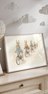 En charmerende og nostalgisk illustration af søde kaniner på cykler iført små jakker. Denne plakat bringer en legende og elegant stemning til børneværelset. Perfekt som gave til babyshower, fødselsdag eller til enhver, der elsker dyr og eventyrlig kunst.