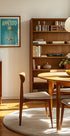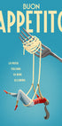 En farverig og legende italiensk-inspireret plakat, med en illustration af en kvinde, der gynger på pastatråde viklet rundt om en gaffel. Med den markante tekst Buon Appetito fejrer den glæden ved italiensk mad og dens sjælelige komfort, en blanding af humor og stil i et iøjnefaldende kunstværk.