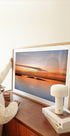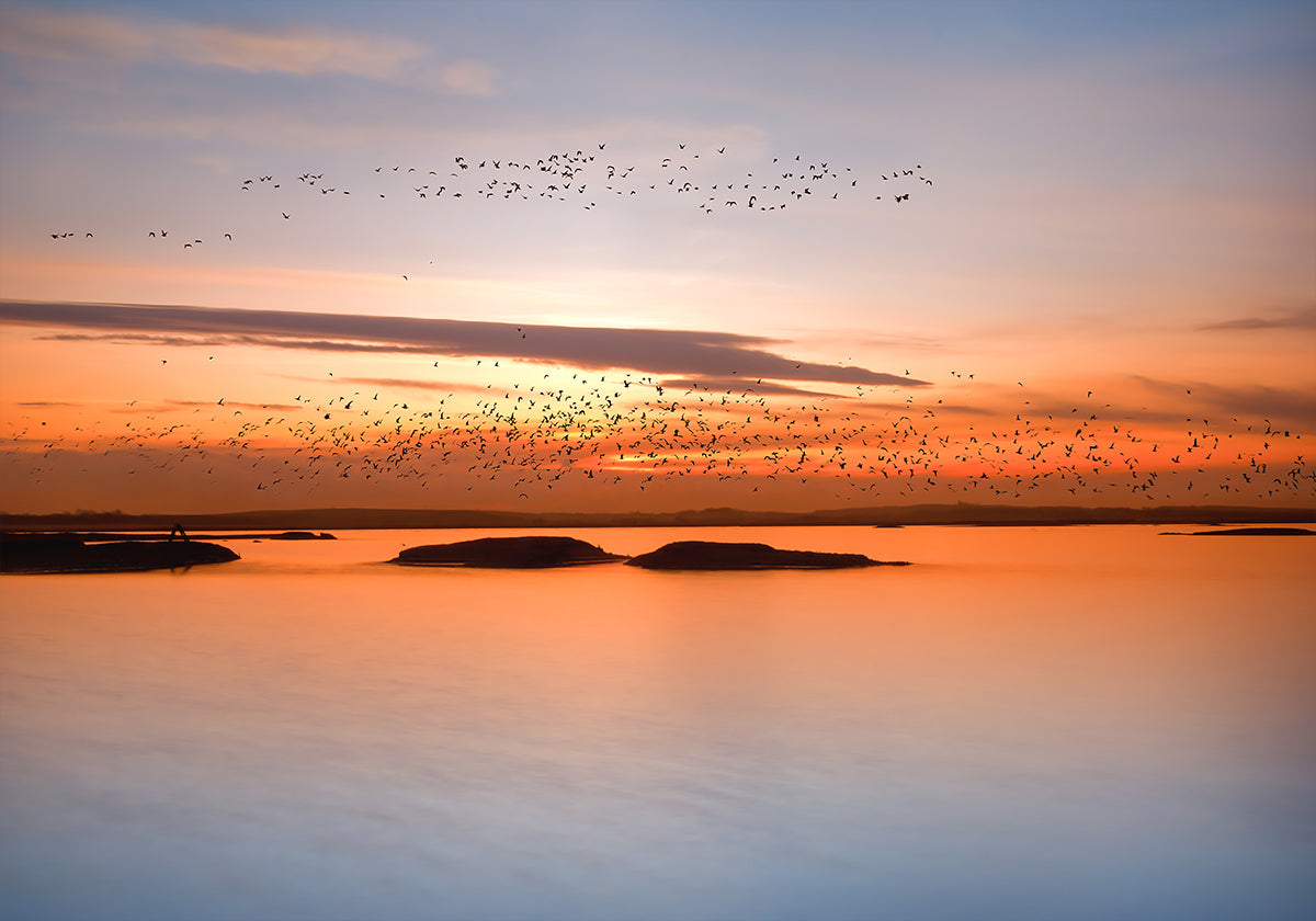 Et betagende langtidseksponeringsfotografi af en solnedgang over stille vand, med en silkeblød overflade, der gløder i orange og lyserøde nuancer. En flok fugle i elegant flugt fuldender scenen og tilfører bevægelse og dybde til dette rolige havlandskab. Perfekt til elskere af rolige, poetiske landskaber.