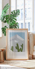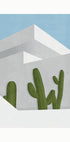 En moderne ørkenæstetik får liv i denne minimalistiske illustration med høje grønne kaktusser indrammet af rene arkitektoniske linjer og en rolig blå himmel. Samspillet mellem lys, skygge og geometri indfanger et solbeskinnet gårdrumsøjeblik — en markant plakat til moderne og naturinspirerede interiører.