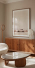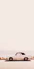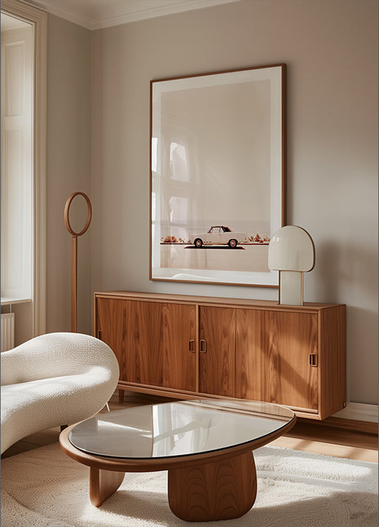 Et minimalistisk og nostalgisk fotografi af en vintage cabriolet parkeret ved havet. Dette kunstværk indfanger essensen af Californiens kyst og vækker minder om roadtrips, sommerdage og tidløs retro charme.