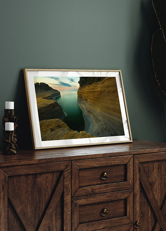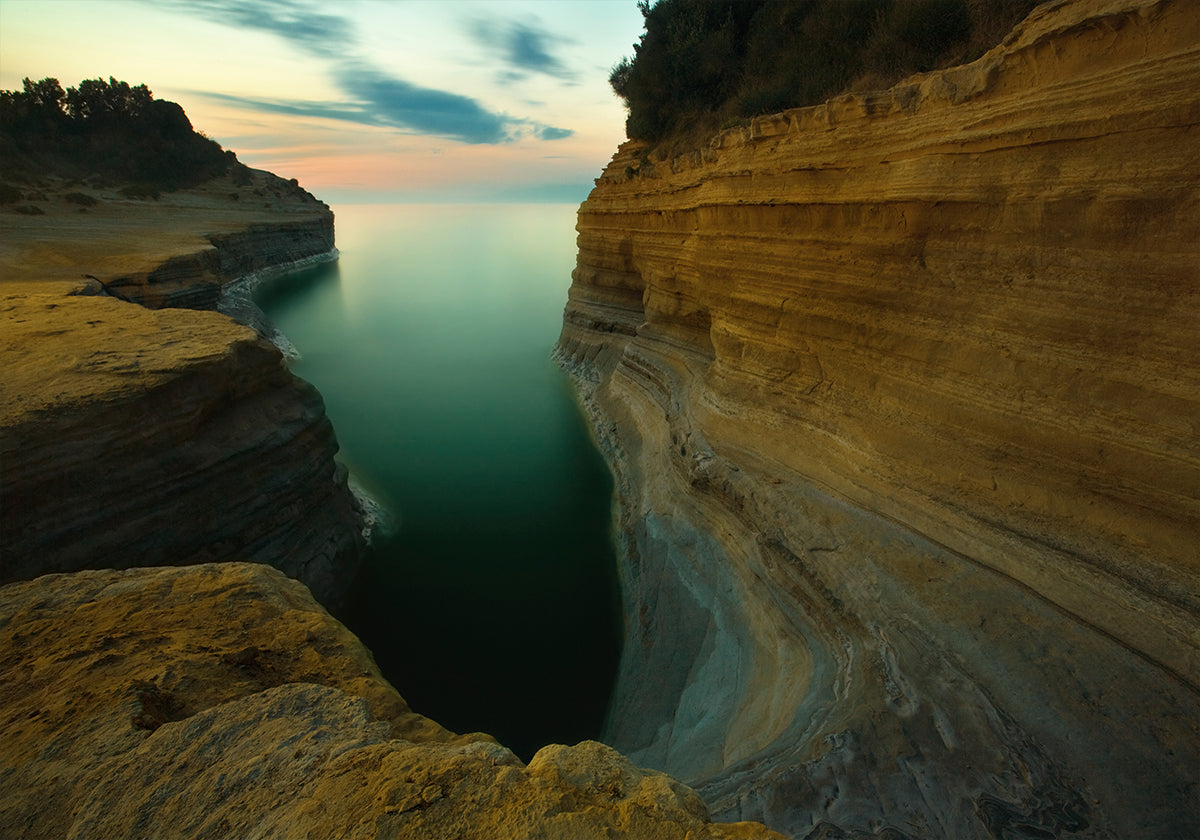 Et fredfyldt langtidseksponeringsbillede af den ikoniske Canal d’Amour på Korfu, Grækenland. Det smaragdgrønne vand er indrammet af dramatiske sandstensklipper, hvilket skaber en mystisk og romantisk stemning. Dette kystlandskab indfanger naturens skønhed, tidløs ro og den legendariske charme ved Det Ioniske Hav.