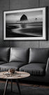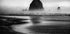 Et dramatisk sort-hvidt fotografi af Cannon Beach i Oregon, med den ikoniske Haystack Rock, der rejser sig fra det tågede hav. De monokrome toner fremhæver teksturerne i sand, bølger og klipper, og giver en stemning af mystik og tidløs skønhed i dette kystlandskab.