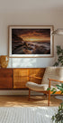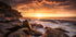 Et betagende havlandskab ved Cape Solander, Sydney, fanget ved solopgang. Det gyldne sollys strømmer over horisonten og oplyser havets bølger og de rå klipper med et varmt, glødende lys. Det silkebløde vand, skabt af lang eksponering, står i smuk kontrast til den dramatiske, skyfyldte himmel og fremkalder både styrke og ro.