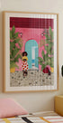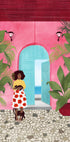 En farverig illustration inspireret af Cartagenas livlige charme. En kvinde i blomsterskørt står ved en turkis døråbning omgivet af frodige tropiske planter, mens legesyge sorte katte slapper af omkring hende. Den lyserøde facade, havudsigten og de livlige detaljer fremkalder varmen og sommerstemningen ved den caribiske kyst.