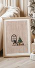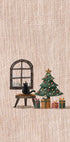 Et charmerende broderiinspireret kunstværk med en sort kat, der sidder ved et vindue og kigger ud på sneen. Et pyntet juletræ med gaver skaber hygge og julestemning, perfekt som juledekor til hjemmet.