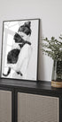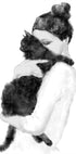 En sart sort-hvid illustration i akvarelstil af en kvinde, der omfavner sin kat. Dette følsomme kunstværk udtrykker kærlighed, intimitet og det tidløse bånd mellem menneske og kæledyr, perfekt til minimalistiske og dyreinspirerede interiører.