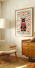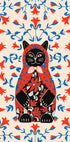 En legesyg og farverig illustration af en smilende kat designet som en russisk matryoshka-dukke, dekoreret med røde og blå blomster. Perfekt til børneværelser, charmerende interiør eller til alle, der elsker finurlig kattekunst med et glædeligt udtryk.