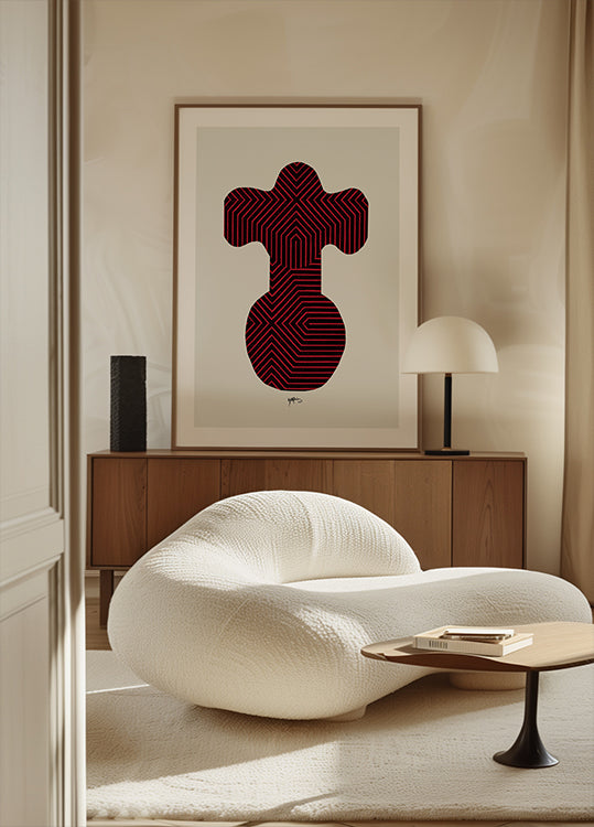 Celestial Garden II – red version af Paulina Vårregn forener geometrisk abstraktion og organiske former i dybe røde nuancer. Totemiske figurer og fine linjer skaber en vertikal rytme mellem kosmisk ro og botanisk energi – en raffineret, minimalistisk plakat til moderne rum. Ideel til stue, kontor og gallerivægge.