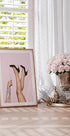 En dristig og stilfuld plakat, der udstråler feststemning med elegante ben i sorte højhælede sko og et funklende champagneglas mod en pastellyserød baggrund. Kombinationen af mode, fejring og discoglans gør dette til en perfekt statement-plakat til moderne interiør.