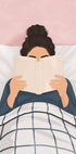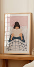En rolig og hyggelig illustration af en kvinde, der læser i sengen foran en lys rosa væg. Værket udstråler ro, selvpleje og varme — ideelt til soveværelser, læsehjørner og andre afslappede rum.