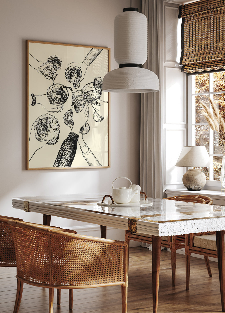 Denne 'Skål'-plakat fanger den festlige og sociale ånd ved at hæve et glas i en skål. Den er perfekt til at tilføje en livlig og opmuntrende atmosfære til ethvert rum, hvad enten det er derhjemme, på kontoret eller til en fest. Med sit enkle, men effektive design, fungerer det som en perfekt påmindelse om at nyde øjeblikke og fejre livet. En ideel dekoration til dem, der elsker at samle venner og familie til gode stunder.