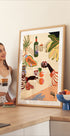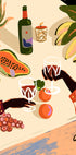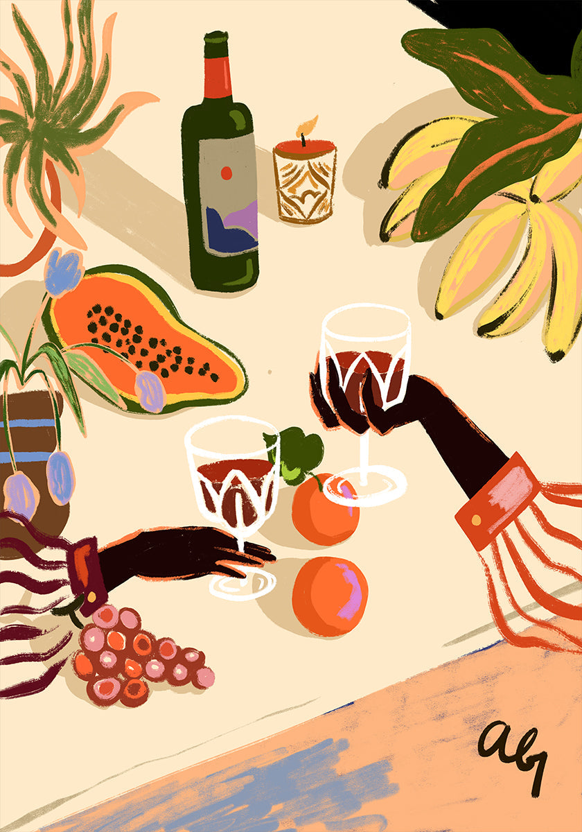 En farverig illustration af et tropisk-inspireret stilleben, med hænder der skåler med vinglas blandt friske frugter, blomster og planter. Med stærke farver og legesyge detaljer fanger værket varmen fra samvær og øliv, og bliver et livligt og stilfuldt statement.