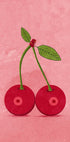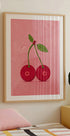 En legesyg og livlig illustration af to kirsebær med blade på en tekstureret lyserød baggrund. Modig, sjov og farverig – dette design giver et friskt pust af humor til køkkener, spisestuer eller moderne interiører og bliver et quirky statement for alle, der elsker frugtinspireret kunst.