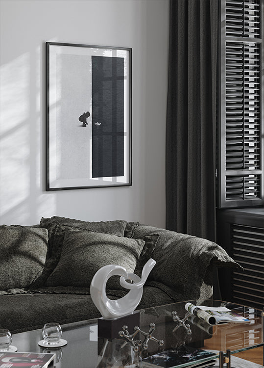 Et slående og symbolsk kunstværk med et barn, der sidder på kanten af en skarp sort-hvid opdeling og ser en skrøbelig papirbåd drive væk. Denne minimalistiske komposition med høj kontrast vækker temaer om barndommens forundring, adskillelse og eftertænksomhed. Perfekt til moderne interiører, konceptuelle kunstelskere og dem, der værdsætter tankevækkende design.