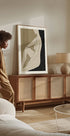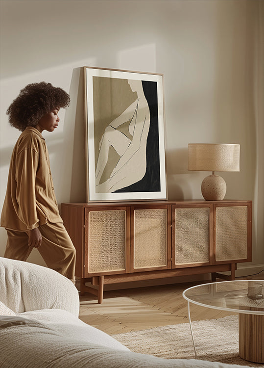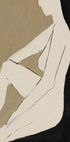 Et roligt og minimalistisk abstrakt kunstværk, der viser en siddende kvindelig form i afdæmpede toner. Med maleriske penselstrøg og moderne enkelhed udtrykker værket ro og afslapning, ideelt til moderne interiør og kunstnerisk vægdekoration.
