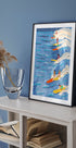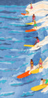 En livlig og farverig illustration af surfere, der rider på bølgerne på longboards, og fanger den ubekymrede energi fra sommer og havliv. Med stærke farver og dynamisk bevægelse fejrer dette værk vandsport, rejse og fritid og passer perfekt i kystinspirerede eller retro surfinteriører.
