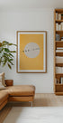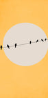 En minimalistisk og stilfuld illustration af fugle på en ledning, silhouetteret mod en cirkulær baggrund med varm gul tone. Dette moderne grafiske kunstværk udstråler ro og balance og bliver et beroligende, men samtidig markant indslag i moderne interiører.