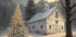 En fredelig sneklædt vinterscene med en hvid lade, blidt faldende sne og et glødende, stedsegrønt træ pyntet med varme lyskæder. Den afbalancerede komposition og de afdæmpede toner skaber en rolig julestemning – klassisk, hyggelig og perfekt til vinterpynt.